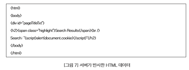 [그림 7]과 같이 그대로 HTML 문서에 포함하여 응답한다. 이 경우 HTML 페이지에 포함된 악성 스크립트가 브라우저에서 실행이 된다.