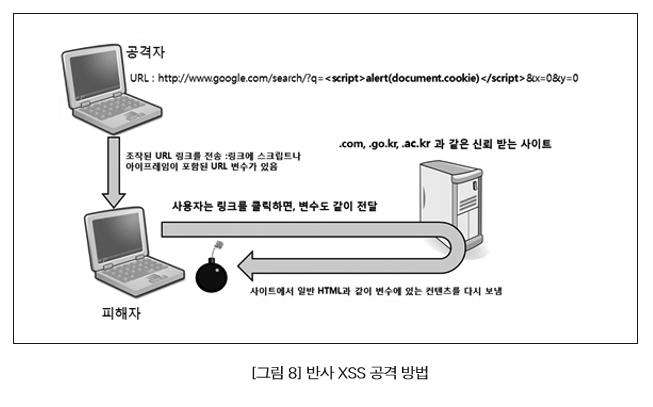 공격자가 웹 서버에 구현된 웹 애플리케이션의 XSS 취약점을 이용하여 서버 측 또는 URL에 미리 삽입을 해 놓은 악성 스크립트가 애플리케이션에서 브라우저로 전달되는 데이터에 포함되어 개인의 브라우저에서 실행되면서 해킹을 하는 것을 의미한다.