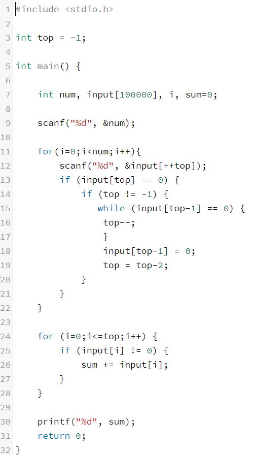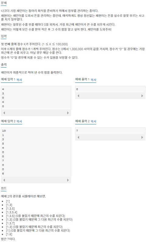 2) 입력받은 숫자가 0이라면, 최근의 수를 0으로 바꿔준다. (지우는 것과 같다.)