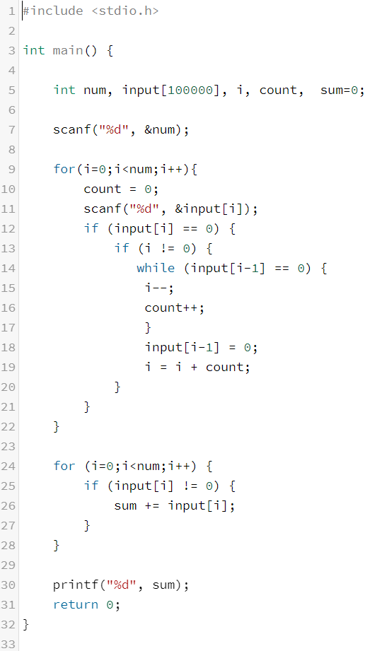 3) for문을 이용하여 배열에 들어있는 값들을 검색해 0이 아닌 값들끼리 더해준다.