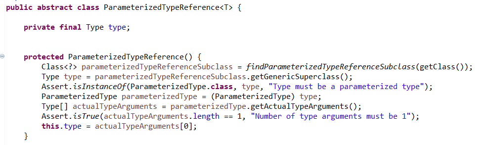 'ParameterizedTypeReference<T>' 클래스를 보면 생성자에서 'getGenericSuperclass()'으로 상속 받은 클래스의 타입인 ' ParameterizedTypeReference'를 추출하고 'getActualTypeArguments()'로 지정한 타입인 'ResponseDTO<PlaceDto>'를 가져와 클래스의 필드에 저장한다.