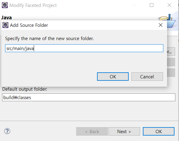 Java를 새로 추가했다면 다음 창이 나올텐데 Build Path를 설정해주는 부분으로,