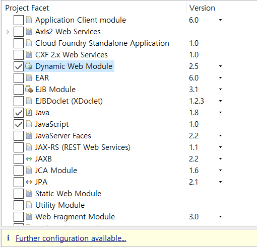 Dynamic Web Module을 체크해주고 Java, JavaScript도 없었다면 체크해준다.